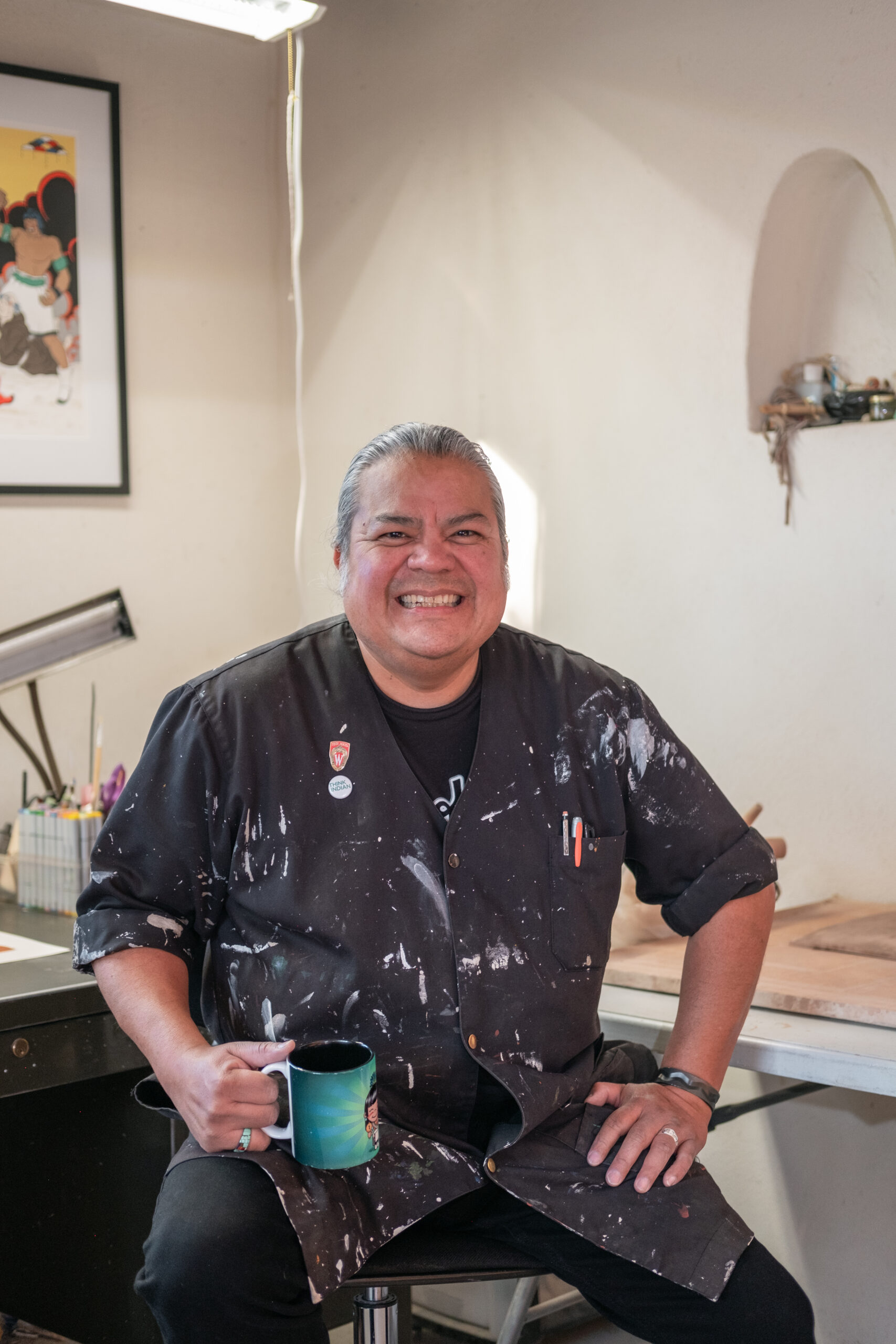 Jason Garcia’s (Okuu Pín/‘Turtle Mountain’) work documents the ever-changing cultural landscape of his home of Kha’p’o Owingeh/Santa Clara Pueblo, NM. Garcia’s Tewa cultural ceremonies, traditions, and stories, as well as 21st-century popular culture, comic books, and technology, influence his clay and print work. Using traditional materials and traditional Pueblo pottery techniques coupled with various printmaking techniques, this juxtaposition of customary and contemporary materials and techniques connects him to his Ancestral past, landscape, and cultural knowledge. His work has been exhibited in many Museums and various exhibitions in the Southwest and the Midwest United States, these include the National Museum of the American Indian, Arizona State University, the Nelson-Atkins Museum of Art, the Colby Museum of Art, and the Peabody Essex Museum. Garcia earned his Bachelor of Fine Arts from the University of New Mexico, Albuquerque, NM, and his Master of Fine Arts in Printmaking at the University of Wisconsin, Madison, WI. Garcia resides and works in his studio located in Santa Clara Pueblo, NM.