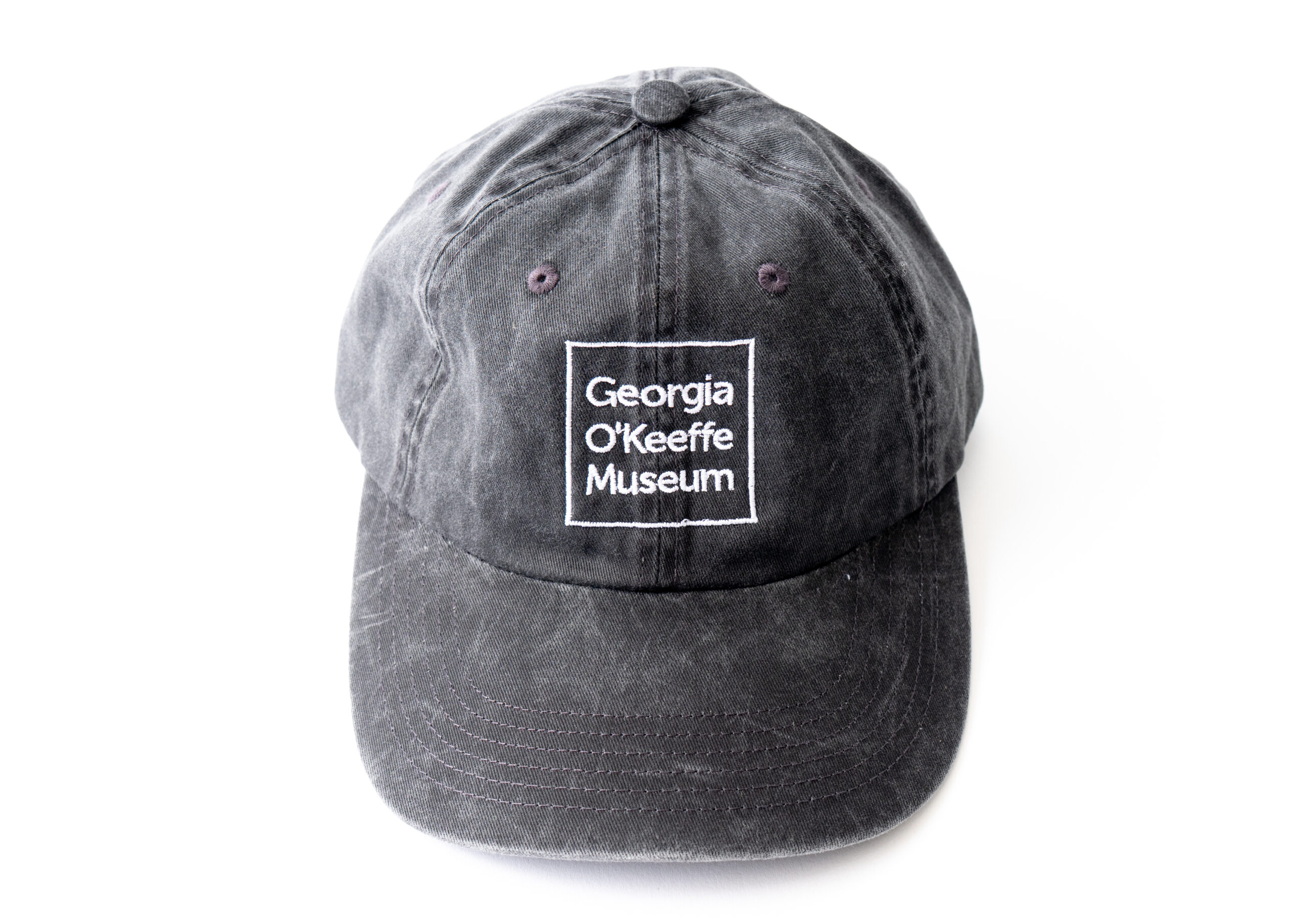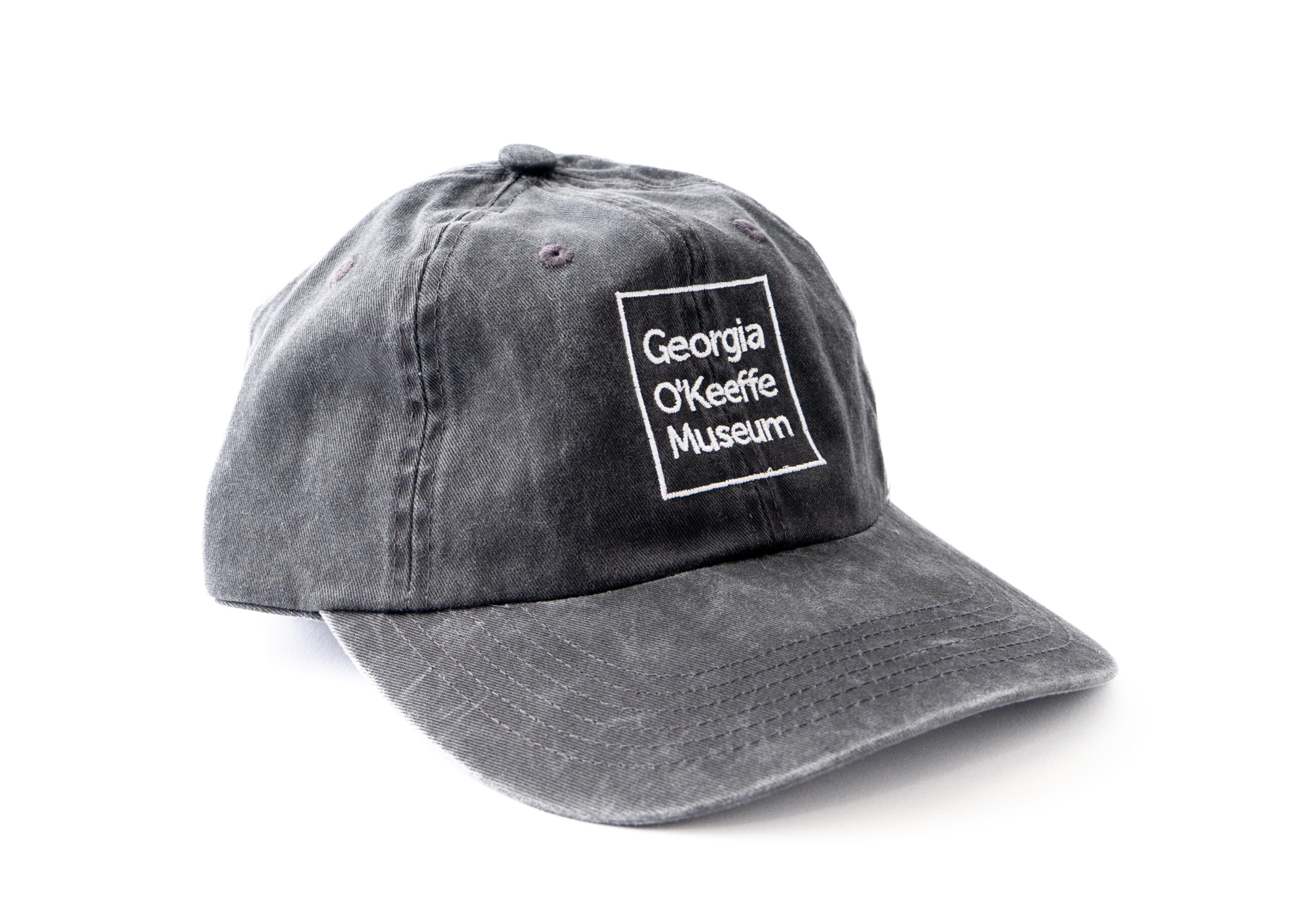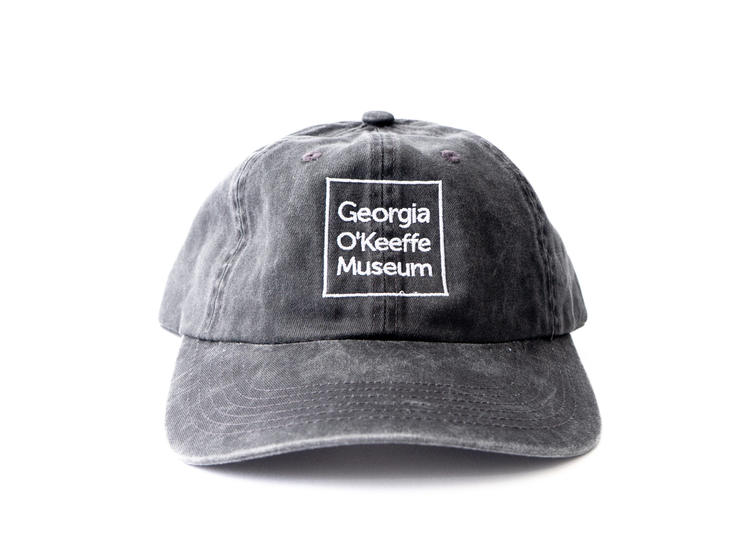 A fitted black ball cap with the Georgia O’Keeffe Museum logo on front in white embroidery. 100% cotton twill with Velcro closure.
